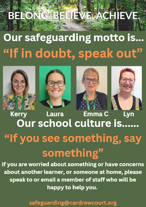 At Cardrew Court, safeguarding is the golden thread through everything we do. Staff know and understand their safeguarding responsibilities, with all staff following Cornwall Children's Partnership procedures and the school safeguarding ethos of; ever in doubt, speak out / if you see something, say something.